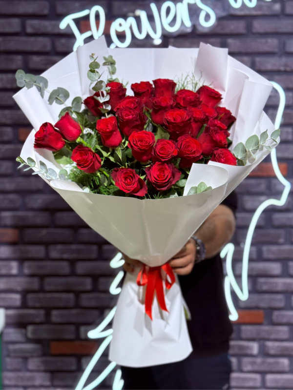 Kırmzı Gül Buketi Beyaz Tasarım 21 Adet